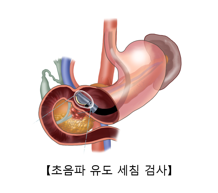 췌장암이 의심되나 복부 전산화단층촬영으로 종양이 발견되지 않는 경우에는 내시경과 내시경 초음파를 이용하여 췌장을 촬영한 후 수술 여부를 결정합니다. 내시경에 의한 진단법은 직경 1cm 정도의 튜브를 구강을 통해 식도와 위를 거쳐 십이지장으로 진행시킨 후 췌관 입구를 관찰하는 방법입니다. 내시경 시행 이전에는 금식이 필요합니다. 분무기를 이용하여 구강 마취를 한 후 시행합니다. 경우에 따라 진정제를 투여하기도 합니다. 일반적으로 위내시경과 동일한 방법으로 시행합니다. 다만 췌관 및 담도의 촬영을 병행하기 때문에 관찰 시간이 상당히 길어질 수 있습니다. 췌장암에 있어 초음파 유도 세침 천자 검사가 가능한 경우에는 진단적 예민도는 약 90%이고, 특이도는 거의 100%로 보고되고 있습니다.